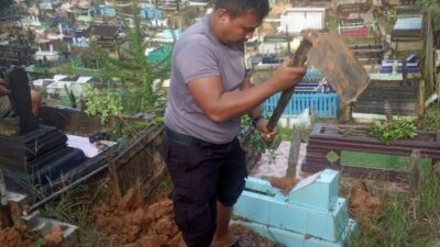 Jakarta. Bripka Joko Hadi Aprianto sehari-hari bertugas di Polsek Samarinda Ulu, Polresta Samarinda, ternyata ‘nyambi’ menjadi penggali kubur.