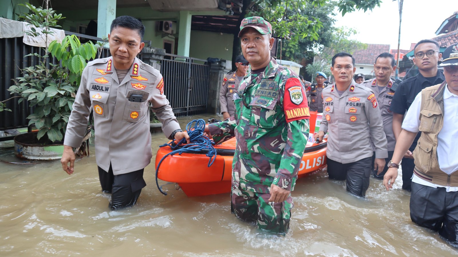 Jakarta. Banjir melanda Perumahan Asri Sawangan, Depok, Jawa Barat, dengan ketinggian air mencapai 1,5 meter. Polri-TNI pun sigap membagikan makanan ke warga yang terdampak.