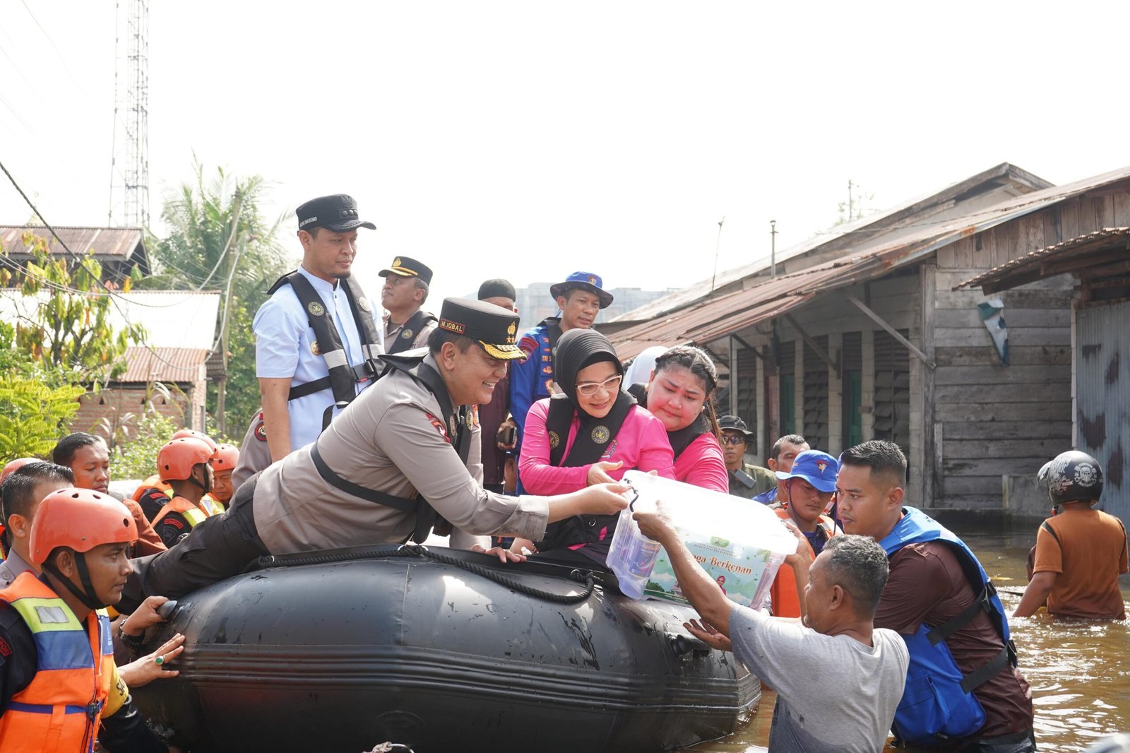 Kapolda Riau Irjen Pol Mohammad Iqbal, S.I.K., M.H. didampingi Ketua Bhayangkari Daerah Riau Ny Nindya Iqbal tinjau langsung warga korban banjir di Jalan Yos Sudarso Rumbai kota Pekanbaru, Jum’at (7/3/2024).