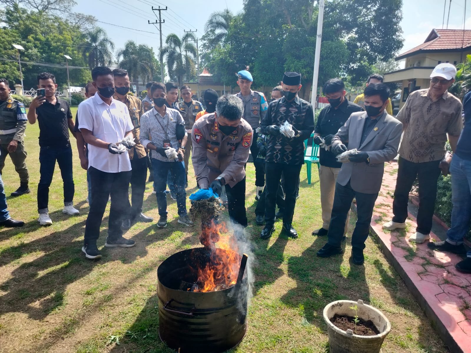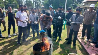 Kali ini dimusnahkan Narkotika Golongan I Jenis Shabu dengan Netto 32,72 gram dan berupa Ganja Kering Netto 904,48 gram beserta tanaman ganja sebanyak 13 batang yang disita di Desa Lido Kecamatan Belo Kabupaten Bima baru-baru ini.