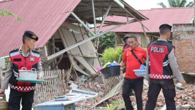 Bengkulu – Sebagai bentuk kepedulian terhadap masyarakat terdampak bencana alam, personel Direktorat Samapta Polda Bengkulu turun langsung ke lokasi untuk membantu warga membersihkan puing-puing rumah yang roboh akibat gempa bumi berkekuatan 6,3 Skala Richter yang mengguncang wilayah Bengkulu pada Jumat dini hari, pukul 02.52 WIB.