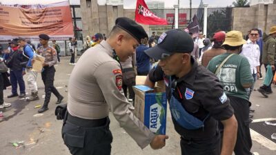 Jakarta – Di sela-sela pengamanan aksi unjuk rasa elemen buruh di depan Gedung DPR/MPR RI, Kamis (28/8/2025), personel Samapta Polda Metro Jaya melakukan aksi simpatik dengan membagikan air mineral dan roti kepada para peserta aksi.