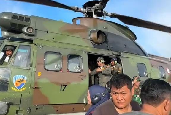 Dari udara, tampak warga berkumpul dan menanti kedatangan helikopter di bawah sana. Berdasarkan arahan Marlina, pilot akhirnya menemukan sebuah area terbuka yang dinilai cukup aman untuk dijadikan titik pendaratan. Di lokasi itulah helikopter AS-332 C+1 Super Puma / H-3217 menurunkan bantuan berupa sembako dan kebutuhan pokok lainnya.