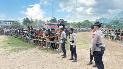 Anggota Ton 1 Dalmas Polres Bima Polda NTB melaksanakan patroli pengamanan pacuan kuda Bupati Cap yang berlokasi di Desa