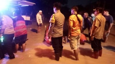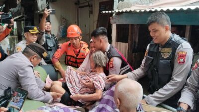Jakarta. Polri melalui tim Detasemen Perintis turun langsung melakukan evakuasi membantu korban banjir di Bekasi dan Depok. Mereka berpatroli