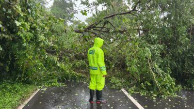 Jateng. Sejumlah personel TNI, Polri, dan relawan bergotong royong melakukan evakuasi sejumlah pohon tumbang di kawasan Gunung Pegat, Kecamatan