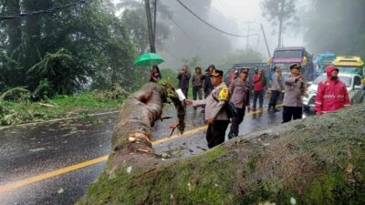 Sumut. Polisi memastikan upaya pembersihan pohon tumbang yang membuat akses jalan ke Brastagi, Sumatera Utara (Sumut), telah dilakukan. Evakuasi